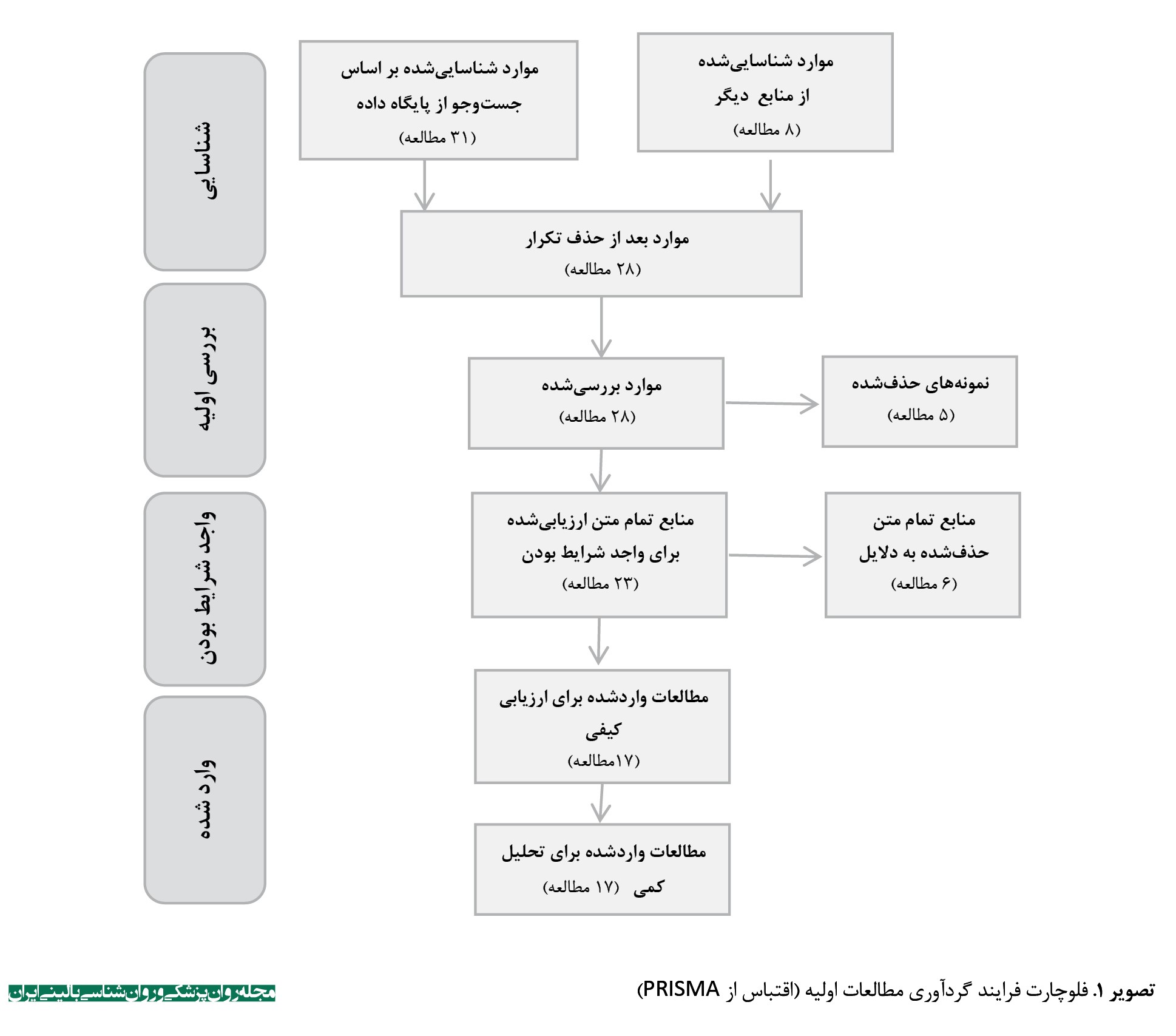 در این مطالعه برای ارزیابی کیفیت مطالعات برای ورود به تحلیل نهایی، از چکلیست پریسما استفاده شد که یک راهنمای طراحیشده 27 گویهایی برای بهبود و توسعه گزارش مرورهای ساختارمند و فراتحلیل است [30].