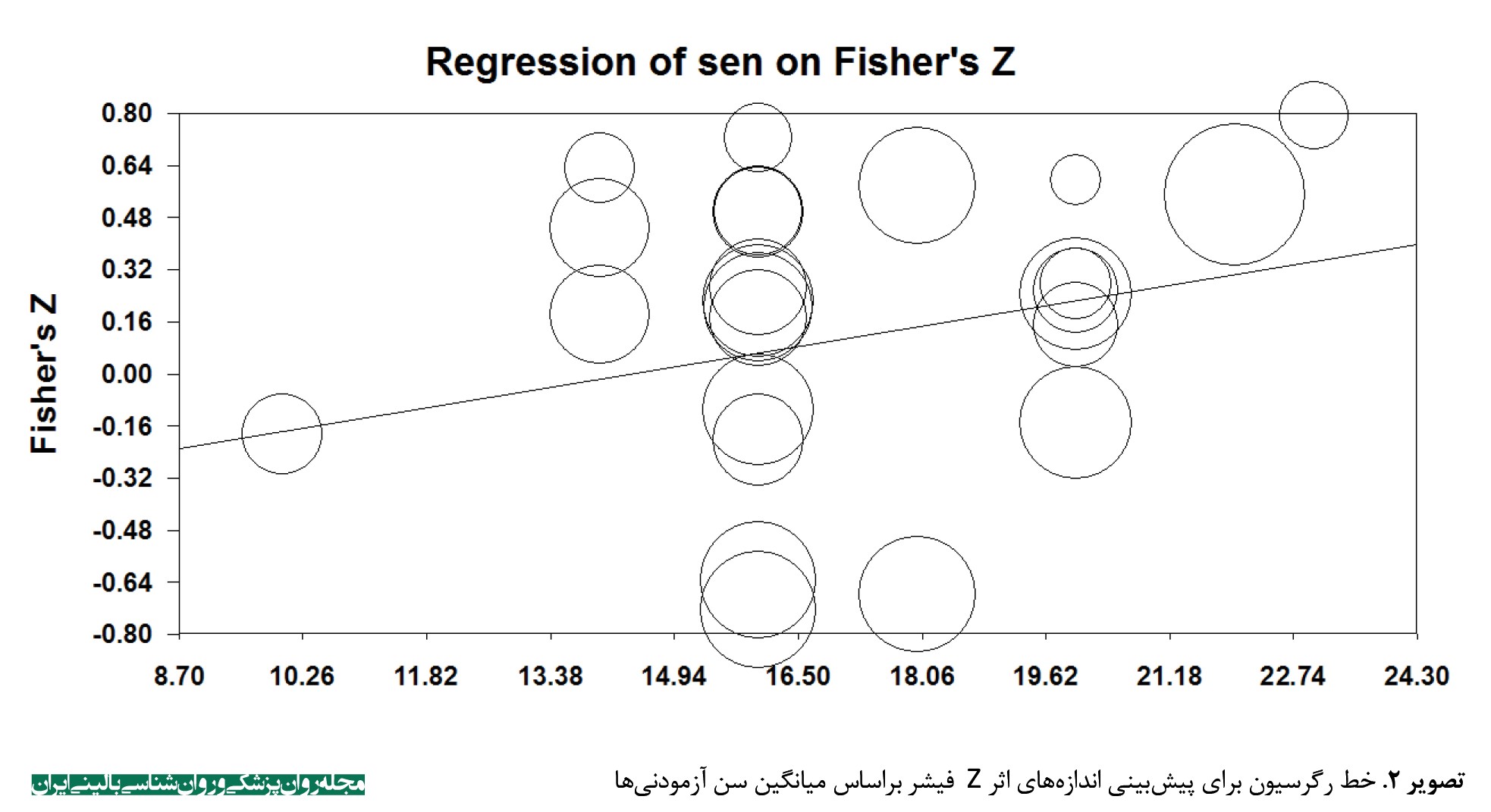 تصویر شماره 2، خط رگرسیون برای پیشبینی اندازههای اثر Z فیشر براساس میانگین سن آزمودنیها در پژوهشهای اولیه، نشان داده شده است؛ مقدار عرض از مبدأ برابر با 0/57 است که ازلحاظ آماری معنیدار است (0/001>P) و مقدار ضریب رگرسیون استانداردنشده آن برابر با 0/04- است که ازلحاظ آماری معنیدار است (0/001>P).
