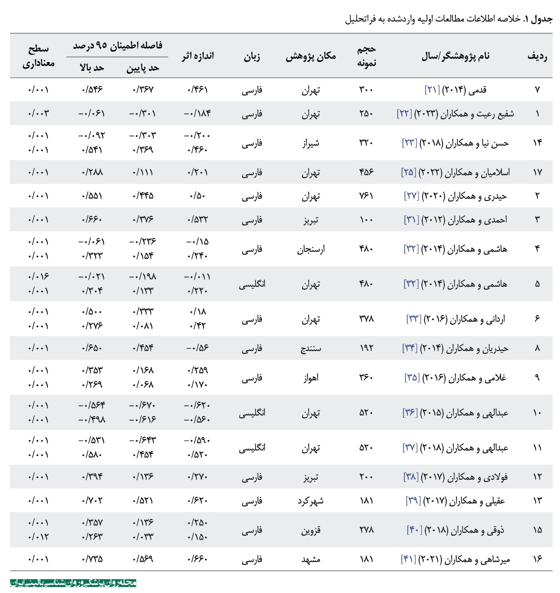از 25 اندازه اثر بهدستآمده، 7 شاخص منفی و 18 شاخص مثبت گزارششده بود. حجم کل دانشآموزان بررسیشده 5957 است که کمترین حجم نمونه مربوط به پژوهش احمدی و همکاران [31] با 100 نفر دانشجو است و بیشترین حجم نمونه مربوط به پژوهش حیدری و همکاران [27] با 761 نفر دانشجو است (