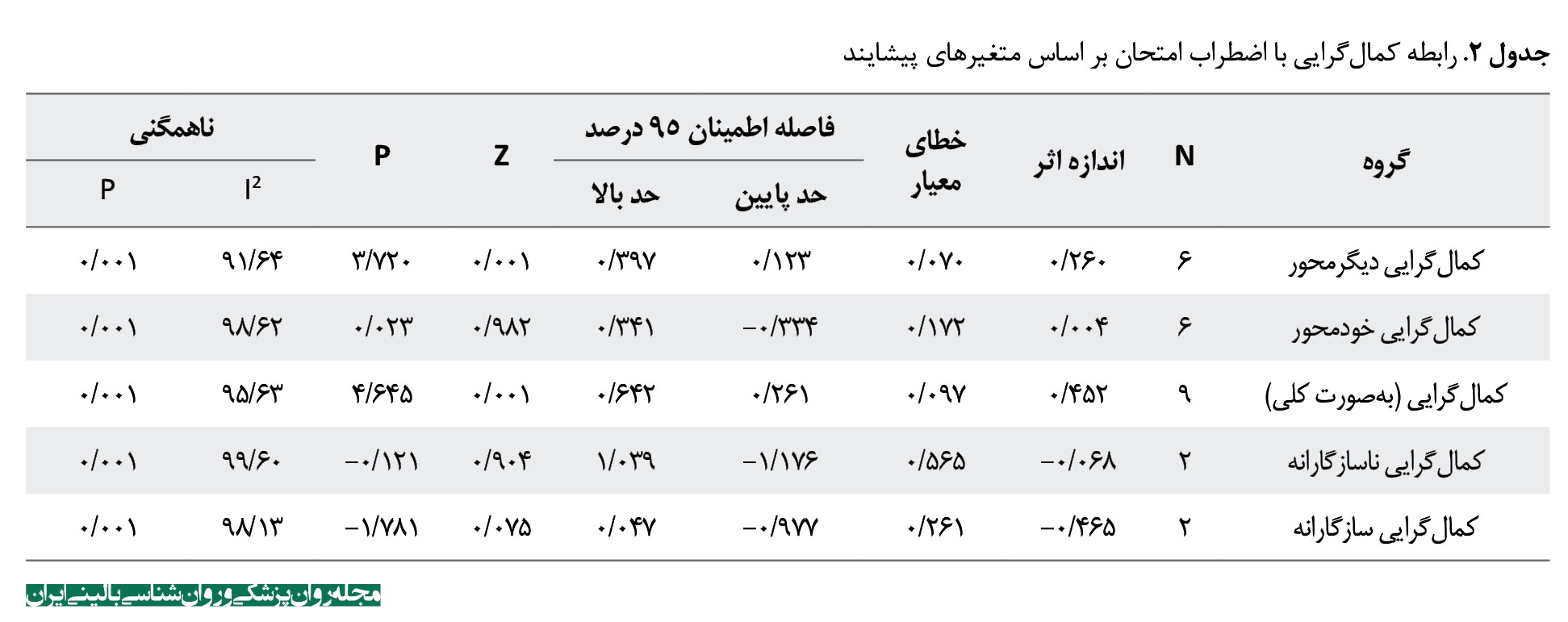 همانگونه که مشاهده میشود، بیشترین اندازه اثر مربوط به متغیر کمالگرایی سازگارانه (0/465-) است و میزان ناهمگنی برای کمالگرایی دیگرمحور، کمالگرایی خودمحور، کمالگرایی کلی، کمالگرایی ناسازگارانه و کمالگرایی سازگارانه بهترتیب 91/64، 98/62، 95/63، 99/60 و 98/13 بود.