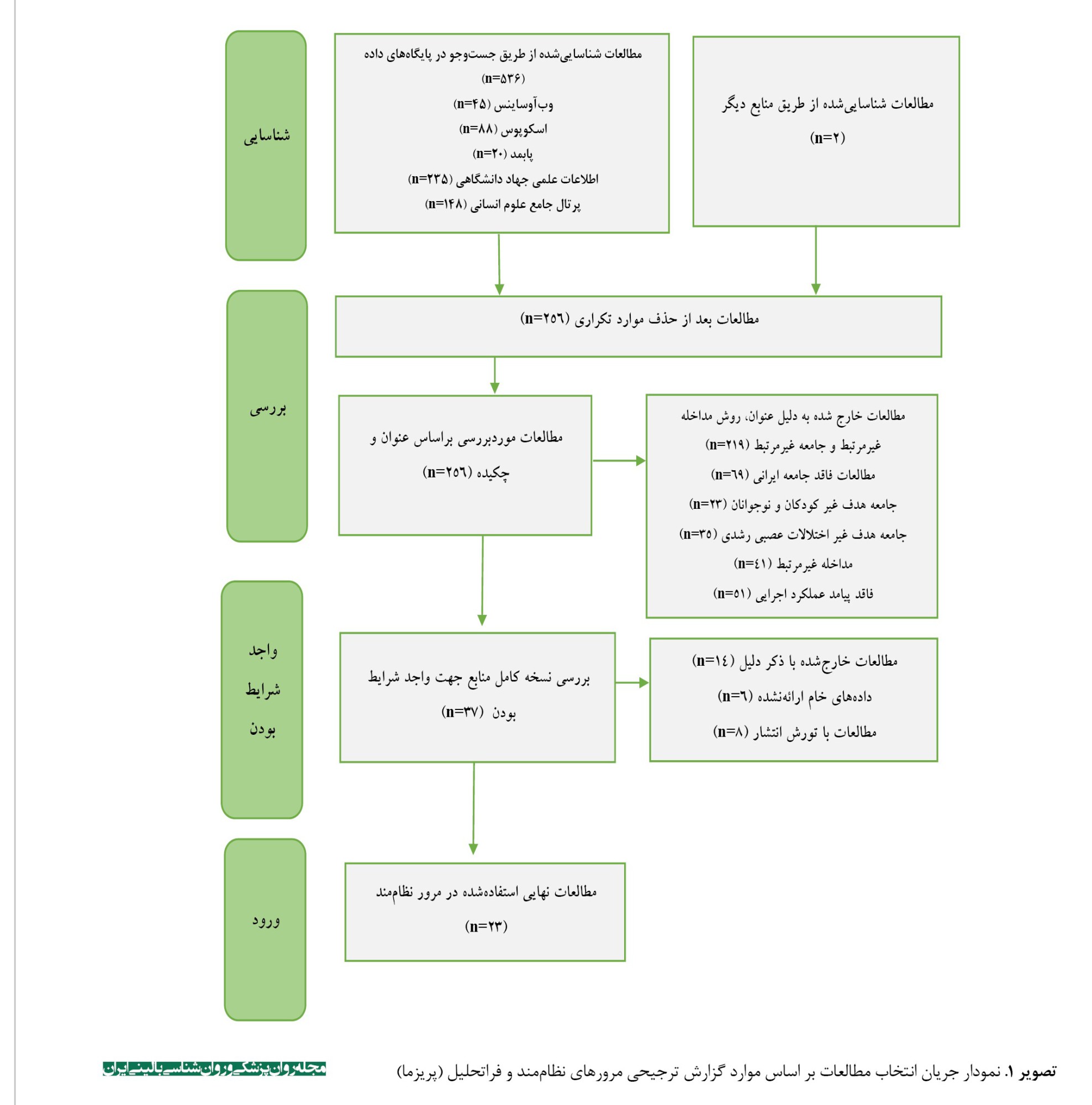 درنهایت 23 مطالعه در مرور نظاممند و فراتحلیل قرار گرفتند. نمودار جریان جستوجو و انتخاب ادبیات طبق دستورالعملهای PRISMA در تصویرشماره 1 نشان داده شده است.