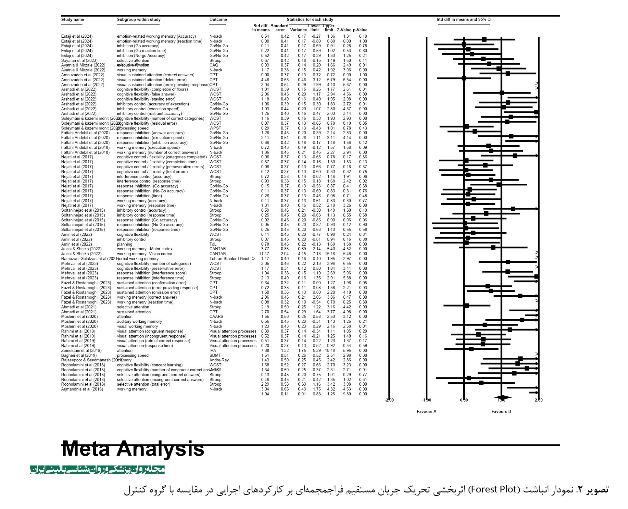 نمودار انباشت اثربخشی تحریک جریان مستقیم فراجمجمهای بر کارکردهای شناختی کودکان و نوجوانان ایرانی مبتلا به اختلالات عصبی رشدی در مقایسه با گروه کنترل در تصویر شماره 2 نشان داده شده است.