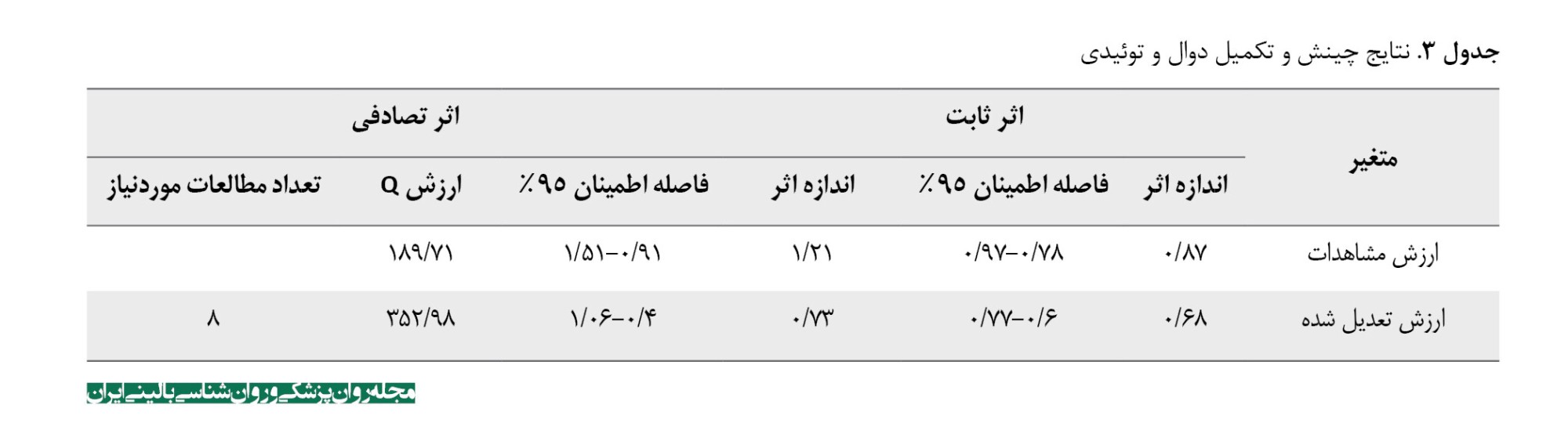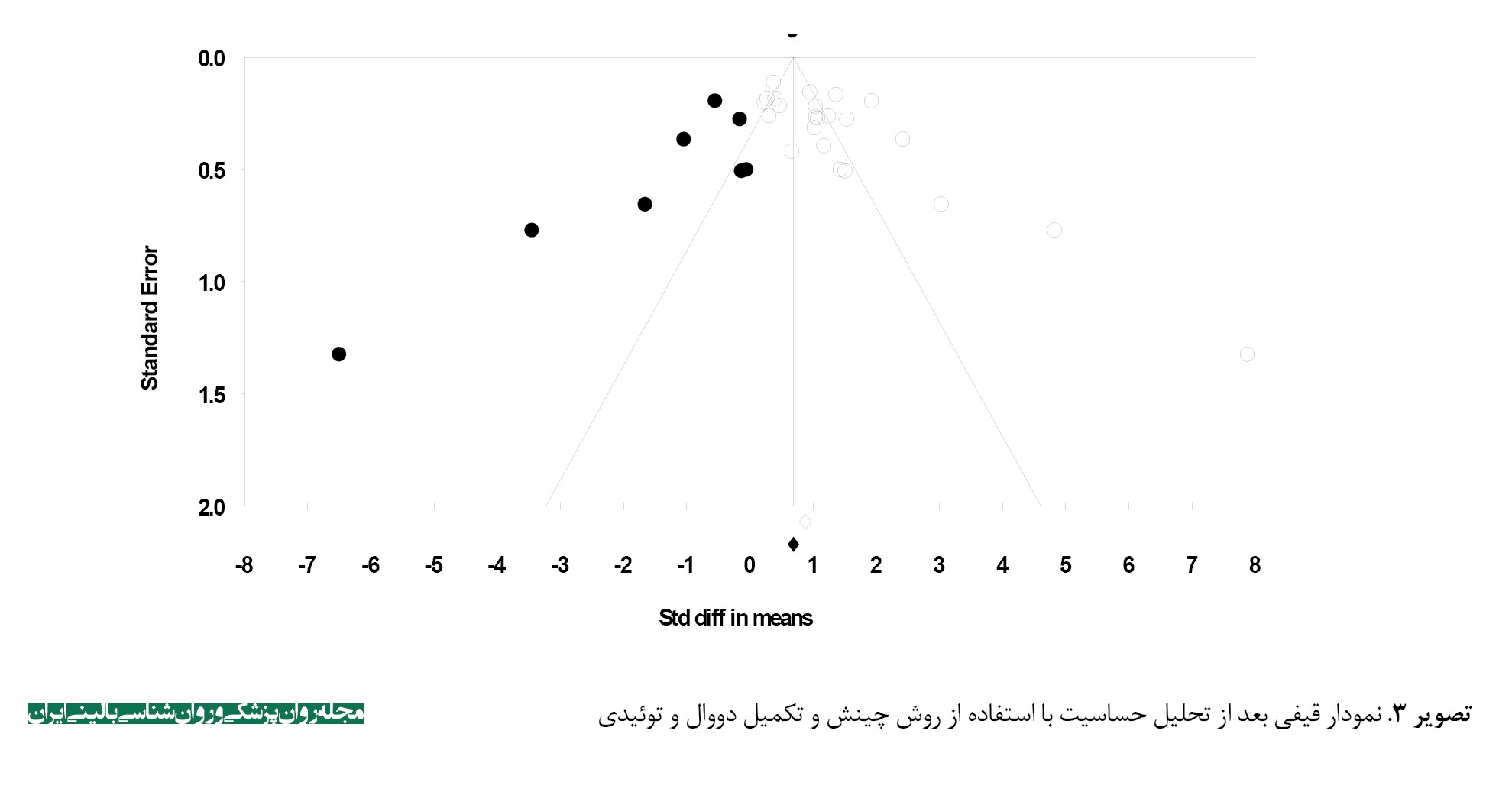 لذا جهت بررسی و اصلاح سوگیری انتشار از روش چینش و تکمیل دووال و توئیدی استفاده شد. در این روش، مطالعات گمشده در سمت چپ نمودار را که ایجاد آنها حالت تورش را از بین میبرد محاسبه مینماید. نتایج روش اصلاح دووال و توئیدی در جدول شماره 3 ارائه شده است. براساس نتایج روش اصلاح دووال و توئیدی با اضافه کردن 8 مطالعه به سمت چپ میانگین نمودار قیفی حالت متقارن پیدا میکند.