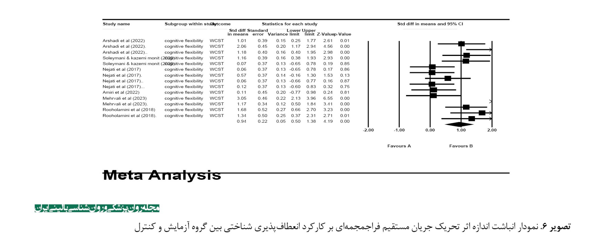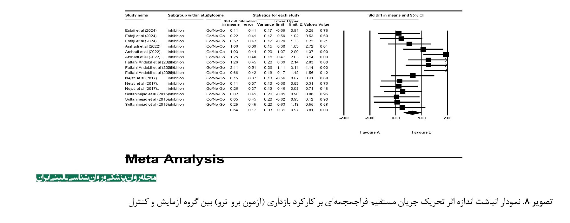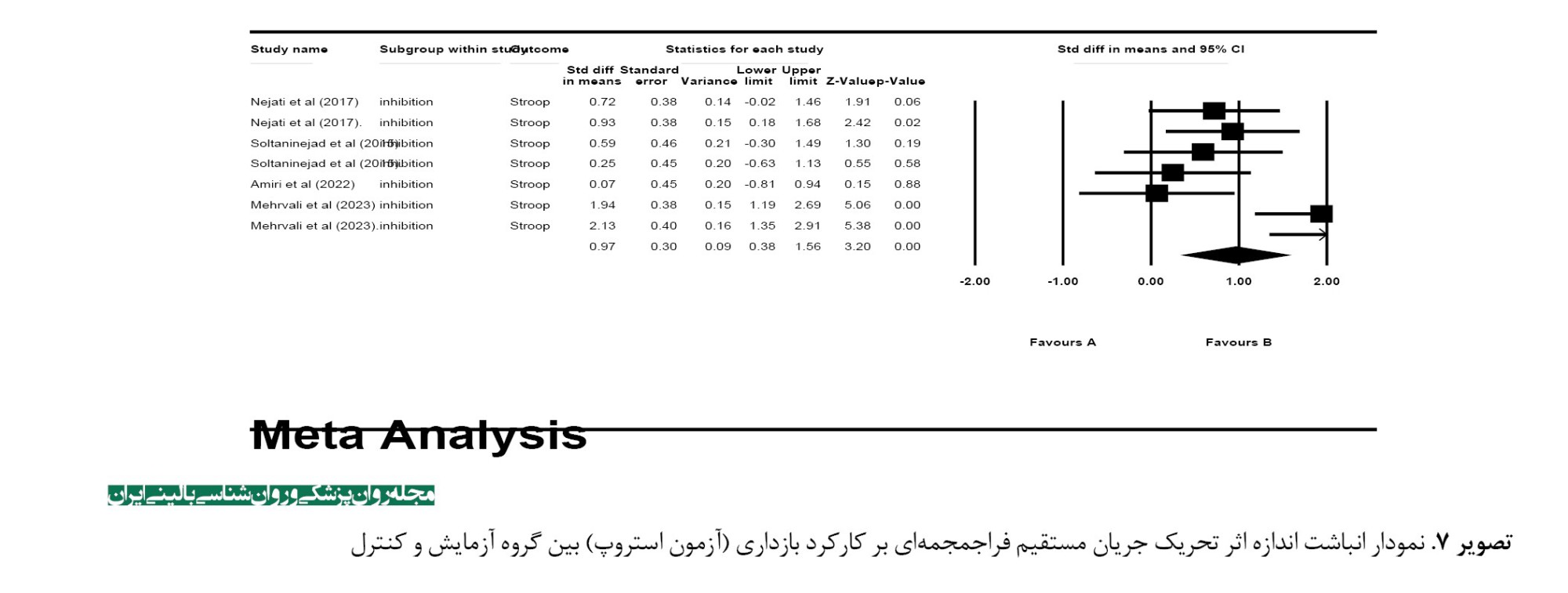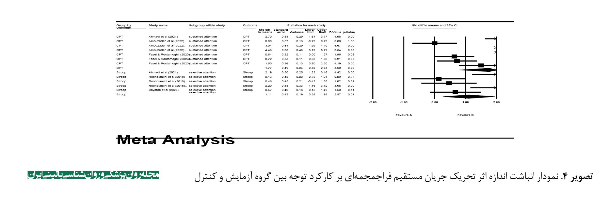 بهطور خلاصه تجزیهوتحلیل زیرگروهی براساس نوع آزمون اجرایی نشان داد تحریک جریان مستقیم فراجمجمهای بیشترین تأثیر را بر مؤلفه توجه انتخابی با استفاده آزمون استروپ (1/77=SDM؛ %95، 0/26-1/95=CI؛ 001/P<0) و مؤلفه توجه پیوسته در آزمون عملکرد پیوسته (11/1=SDM؛ %95، 0/8-2/73=CI؛ 001/P<0) نسبت به دیگر مؤلفههای کارکرد اجرایی داشته است.