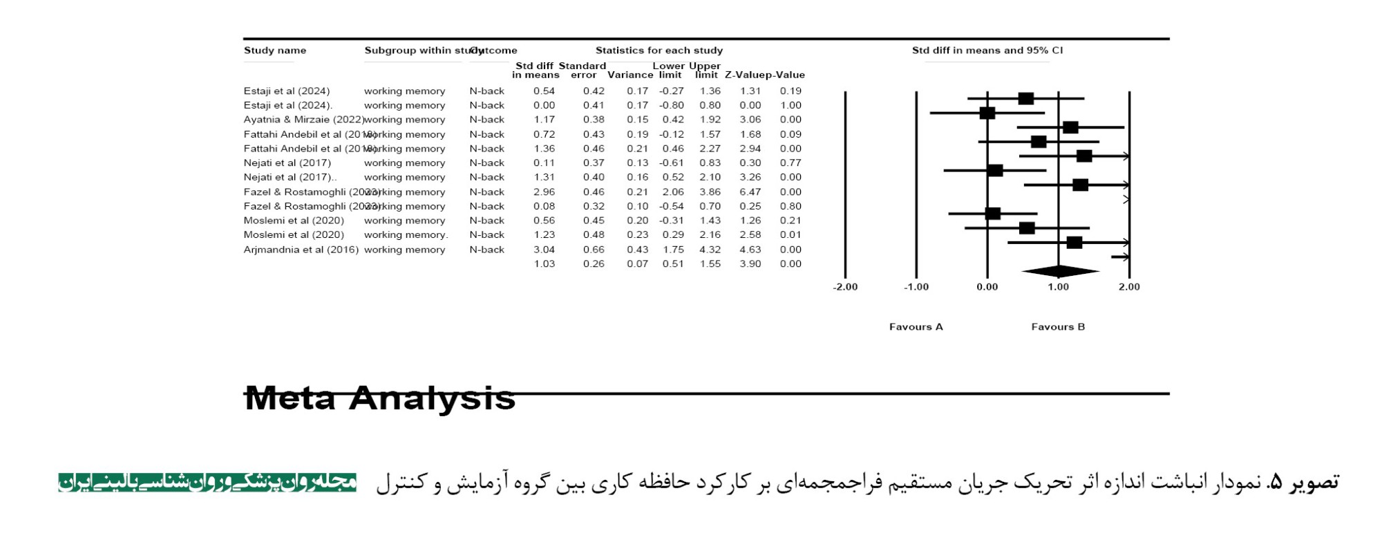 اثر تحریک جریان مستقیم فراجمجمهای بر حافظه کاری در 7 مطالعه با استفاده از آزمون ان-بک (N-back)، مورد ارزیابی قرار گرفت. نتایج فراتحلیل تفاوت معنیداری را بین گروه تحریک جریان مستقیم فراجمجمهای و گروه کنترل در آزمون ان-بک (1/03=SDM؛ %95، 0/51-1/55=CI؛ 001/P<0) نشان داد (تصویر شماره 5).