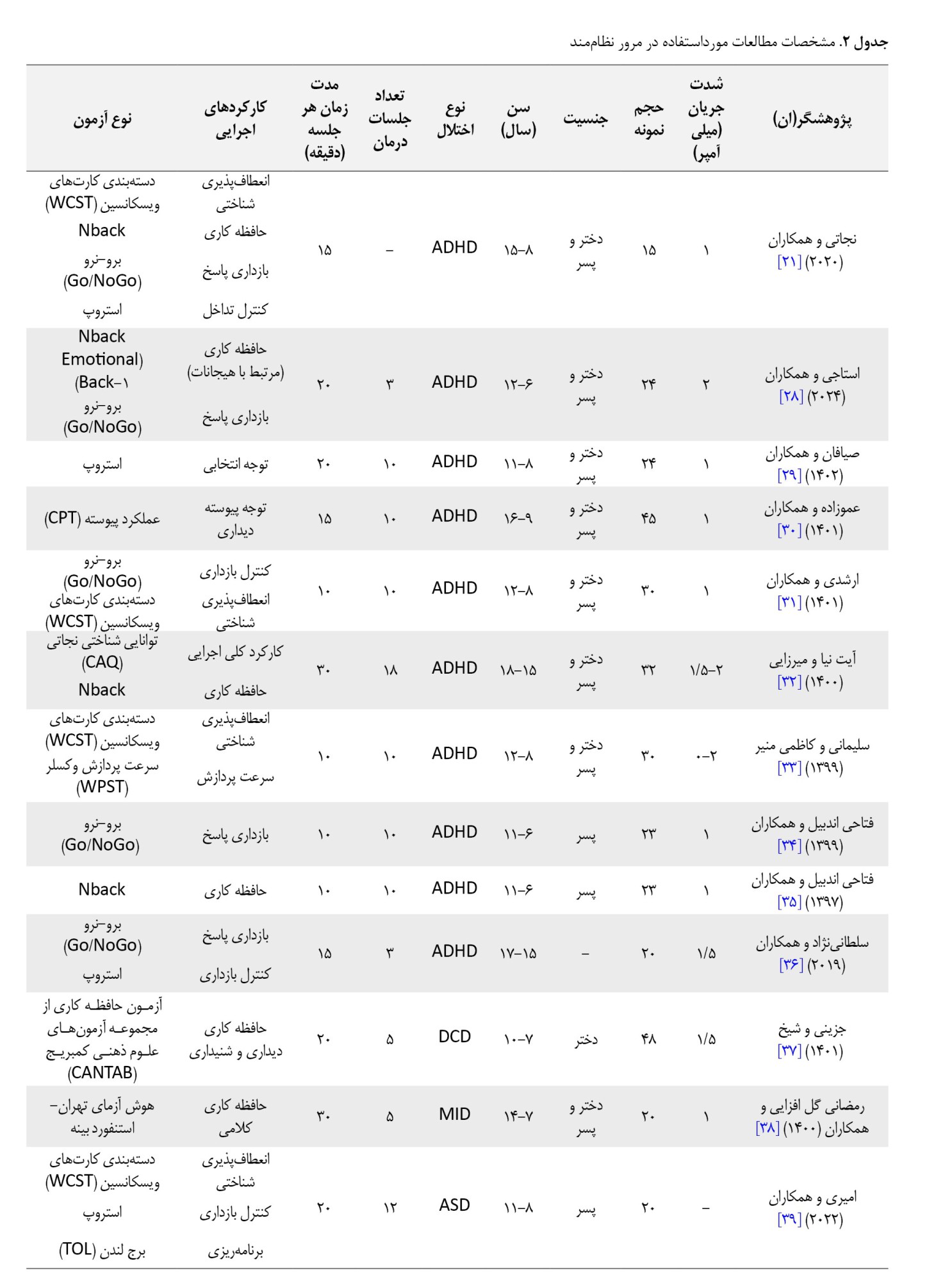 تعداد کل مطالعات واردشده 23 مورد با 74 اندازه اثر بود که مجموعاً 614 نفر را در گروه تحریک جریان مستقیم فراجمجمهای، شم و کنترل ارزیابی کردند. تعداد 10 مطالعه کودکان و نوجوانان مبتلا به اختلال نقص توجه/بیشفعالی (ADHD)، 10 مطالعه کودکان و نوجوانان مبتلا به یادگیری خاص (SLD) ، 1 مطالعه کودکان مبتلا به اختلال طیف اوتیسم (SLD) ، 1 مطالعه کودکان مبتلا به اختلال هماهنگی رشدی (DCD) و 1 مطالعه کودکان و نوجوانان مبتلا به ناتوانی ذهنی خفیف (MID) را بررسی کردند. تعداد جلسات مداخلات بین 3 تا 18 جلسه و مدتزمان هر جلسه از 10 تا 30 دقیقه متغیر بود. ویژگی مطالعات گنجاندهشده در جدول شماره 2 برای مرور نظاممند حاضر ارائه شده است.