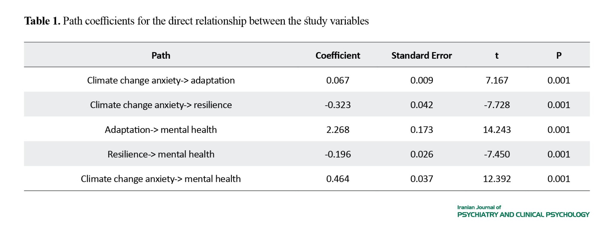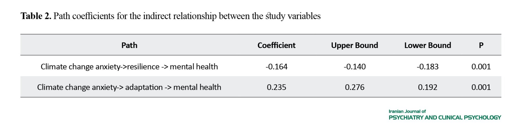 In this study, 1196 Iranian people participated. Their mean age was 33.25 years. In terms of educational levels, 177(14.8%) had lower than high school education, 350(29.3%) had a high school diploma, 132 (11%) had an associate degree, 455(38%) had a bachelor’s degree, and 82(6.9%) had PhD degrees. There was a significant positive relationship between climate change anxiety and mental health (P<0.01, r=0.41) and between adaptation and mental health (P<0.01, r=0.57), while a significant negative relationship was observed between resilience and mental health (P<0.01, r=-0.39). As presented in Tables 1 and 2, the indirect effect of climate change anxiety on mental health was significant through adaptation and resilience (P<0.001). Therefore, the findings of the research indicate that climate change anxiety can predict mental health both directly and indirectly through resilience and adaptation.