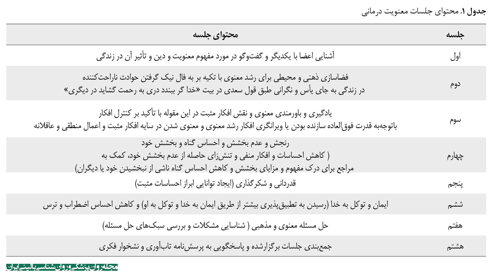 جلسات معنویت درمانی براساس مداخله درمانی [21] و با نگاهی به نظریه توحید درمانی [22] بهمدت 8 جلسه 60 دقیقهای (هر هفته 1 جلسه) بهصورت حضوری در سالن کنفرانس بیمارستان امام علی (ع) زاهدان و در قالب گروههای 6 نفره اجرا شد. جلسات مذکور توسط نویسنده دوم که کارشناس ارشد روان پرستاری است با نظارت روحانی طرح برگزار گردید. 1 ماه پس از پایان جلسات، پسآزمون به روش مصاحبه با مادران تکمیل شد. خلاصه جلسات معنویت درمانی در
