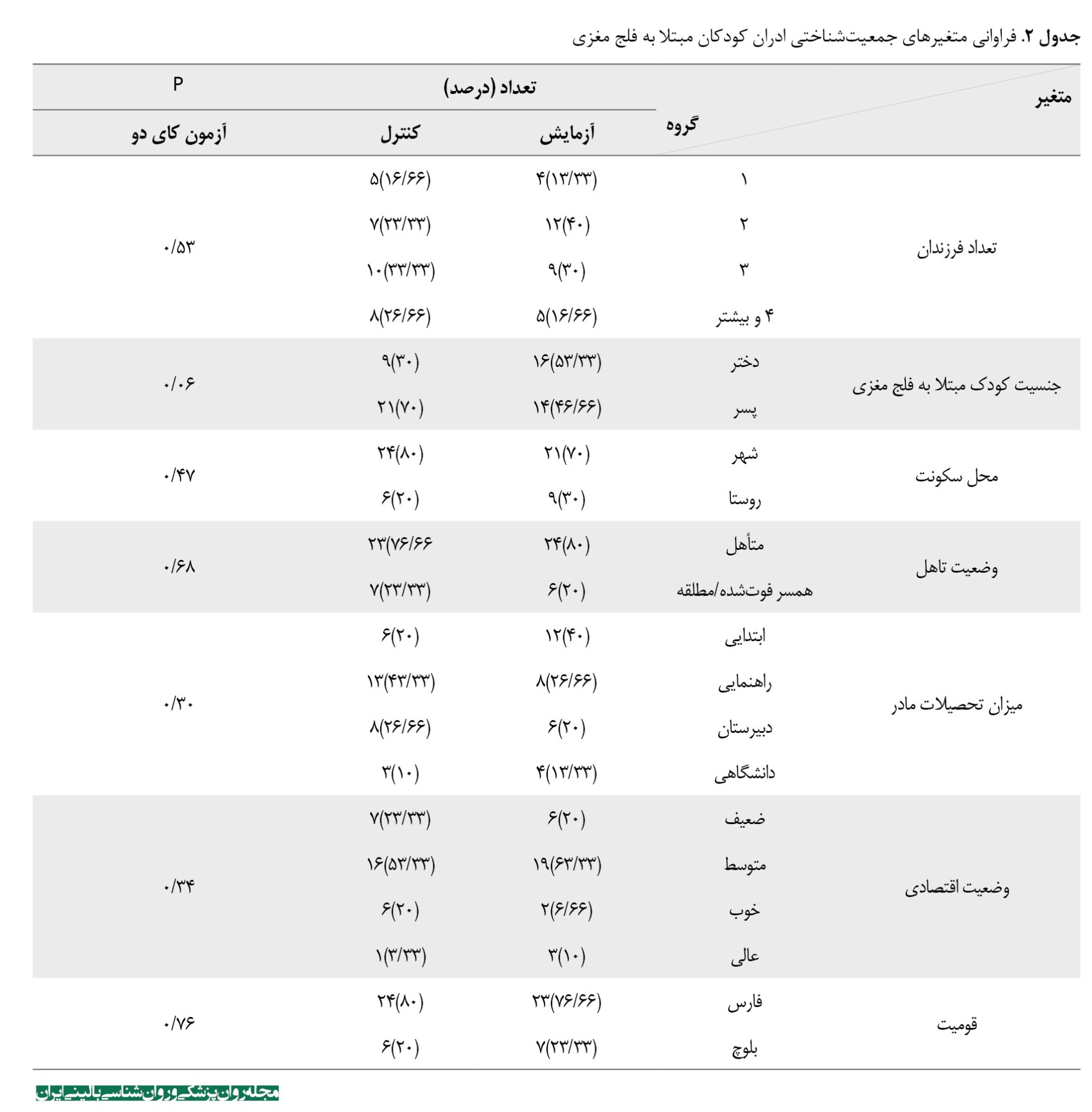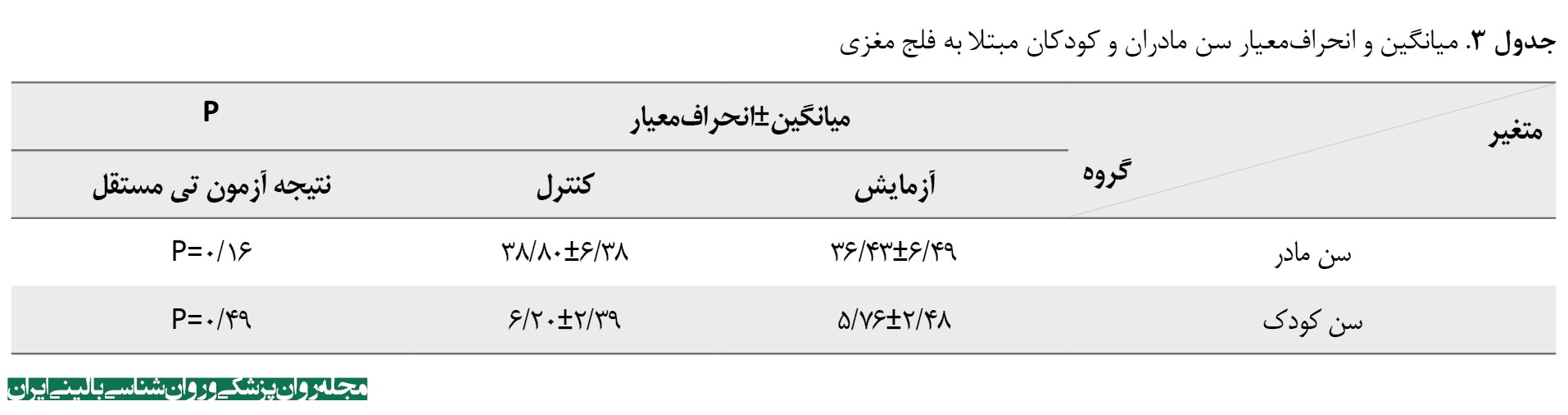 در مجموع 60 نفر وارد مطالعه شدند (30 نفر در هر گروه). در ابتدای مطالعه دو گروه ازنظر تمام ویژگیهای فردی از جمله سن، سن کودک مبتلا به فلج مغزی، وضعیت تأهل، محل سکونت، تعداد فرزندان، قومیت و ضعیت اقتصادی نفاوت معناداری با یکدیگر نداشته (05/P>0) و همگن بودند. یافتههای پژوهش نشان داد بیشتر مادران کودکان مبتلا به فلج مغزی در این مطالعه خانه دار و ساکن شهر بودند (