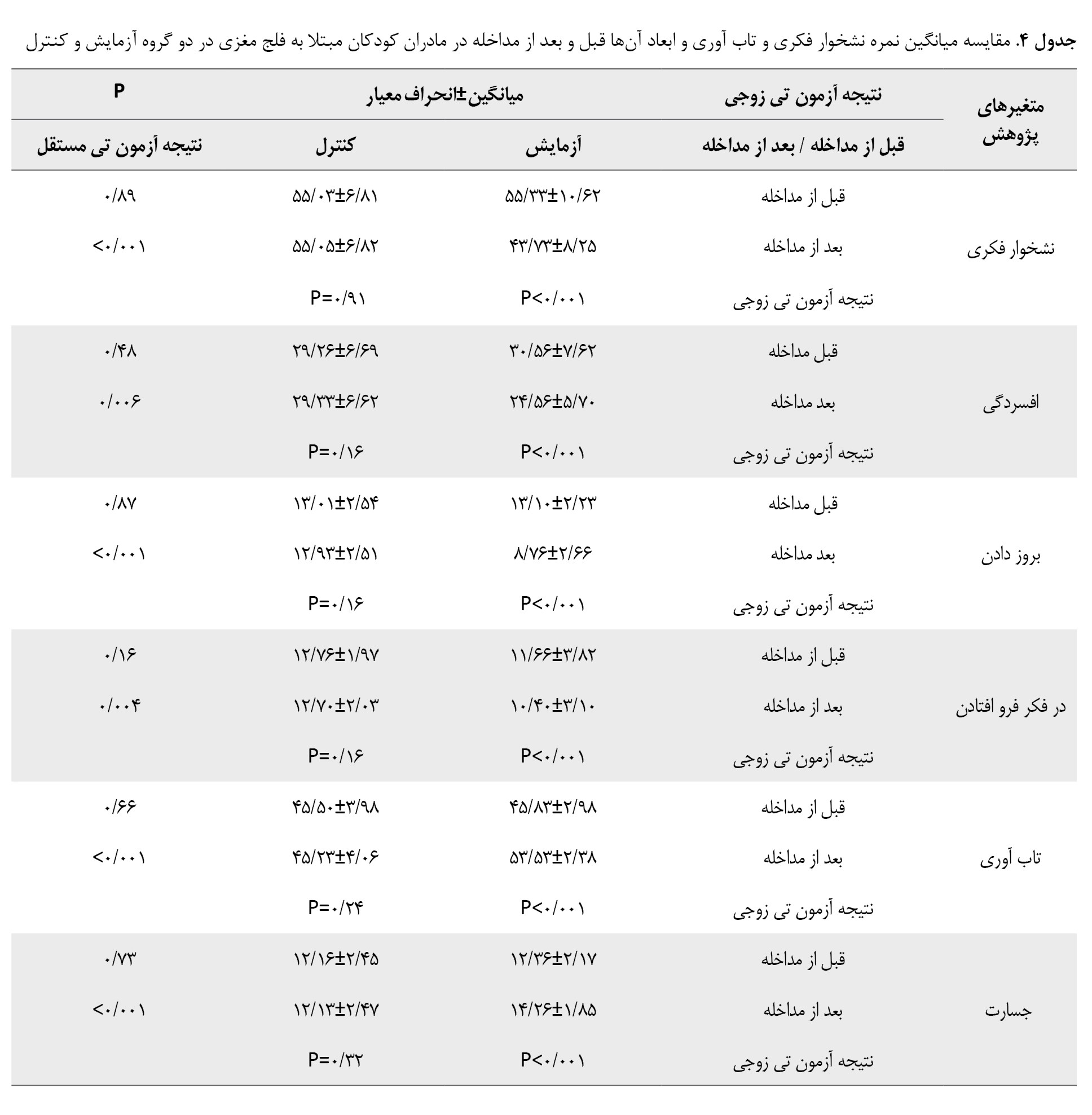 معنویت درمانی موجب بهبود نشخوار فکری و تابآوری مادران کودکان مبتلا به فلج مغزی در گروه آزمایش نسبت به گروه کنترل شد، بهطوریکه اختلاف بین میانگین نمره تابآوری و نشخوار فکری قبل و 1 ماه بعد از مداخله در گروه آزمایش از نظر آماری معنادار بود (001/P<0)، اما در گروه کنترل، قبل و بعد از معنویت درمانی اختلاف معنادار نبود (05/P>0). همچنین بعد از مداخله بین دو گروه در تمامی حیطههای نشخوار فکری ( افسردگی، بروزدادن، در فکر فروافتادن) و تمامی حیطههای تابآوری (جسارت، خوشبینی، کاردانی و هدف) تفاوت آماری معنادار وجود داشت و مادران گروه آزمایش که معنویت درمانی را دریافت کرده بودند، در مقایسه با گروه کنترل به نمرات بالاتری در تابآوری و حیطههای آن و نمرات پایینتری در نشخوار فکری و ابعاد آن دست یافتند (