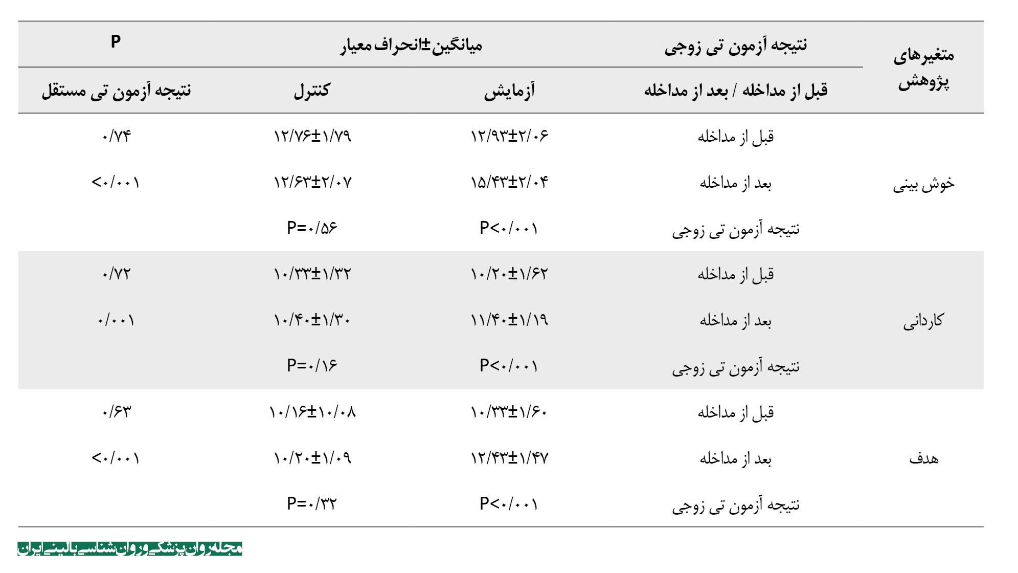 فرض توزیع نرمال بودن نشخوار فکری و تابآوری و حیطههای آنها برقرار بود (05/P>0). مقایسه نشخوار فکری و تابآوری، بین دو گروه قبل از مداخله نشان داد بین میانگین امتیاز کلیه حیطهها، براساس نتایج آزمون تی مستقل اختلاف معنادار آماری وجود نداشته و دو گروه همگن بودند (05/P>0). مقایسه نشخوار فکری 1 ماه بعد از مداخله نشان داد میانگین و انحرافمعیار نمره نشخوار فکری در گروه آزمایش 43/73±8/25 و در گروه کنترل 54/23±6/86 بوده که آزمون تی مستقل این تفاوت را معنادار نشان داد (001/P<0). همچنین نمره تابآوری 1 ماه بعد از مداخله در گروه آزمایش به 53/53±2/38 و در گروه کنترل به 45/01±3/98 رسید که ازنظر آماری این اختلاف معنادار بود (001/P<0) (