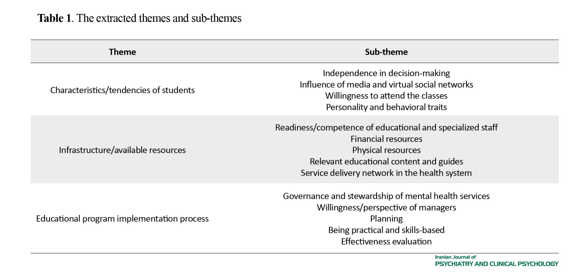 - Borji M, Hajebi A, Naserbakht M, Ranjbar H, Fazeli A, Khorrami Z, Hajebi A. Evaluating the efficacy of school mental health promotion program in iranian schools: A qualitative study. Iranian Journal of Psychiatry and Clinical Psychology. 2023; 29(1):48-65. [DOI:10.32598/ijpcp.29.1.4560.1]