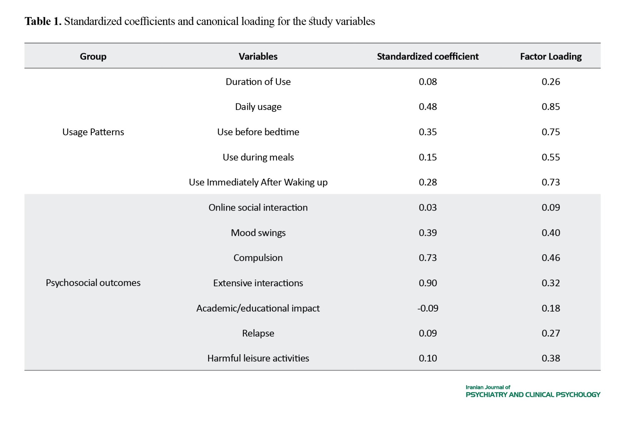 The results of the canonical correlation analysis indicated that among five sets of canonical variables, only the first set yielded a significant correlation coefficient (r= 0.72, P<0.001), explaining 47% of the variance shared by two-variable sets. This value reflects a strong and statistically significant relationship between VSM usage patterns and psychosocial outcomes. As presented in Table 1, among usage patterns, those with the highest canonical loadings included: daily usage (0.85), use before bedtime (0.75), and use immediately after waking up (0.73). The duration of VSM use demonstrated the lowest canonical loading (0.26).